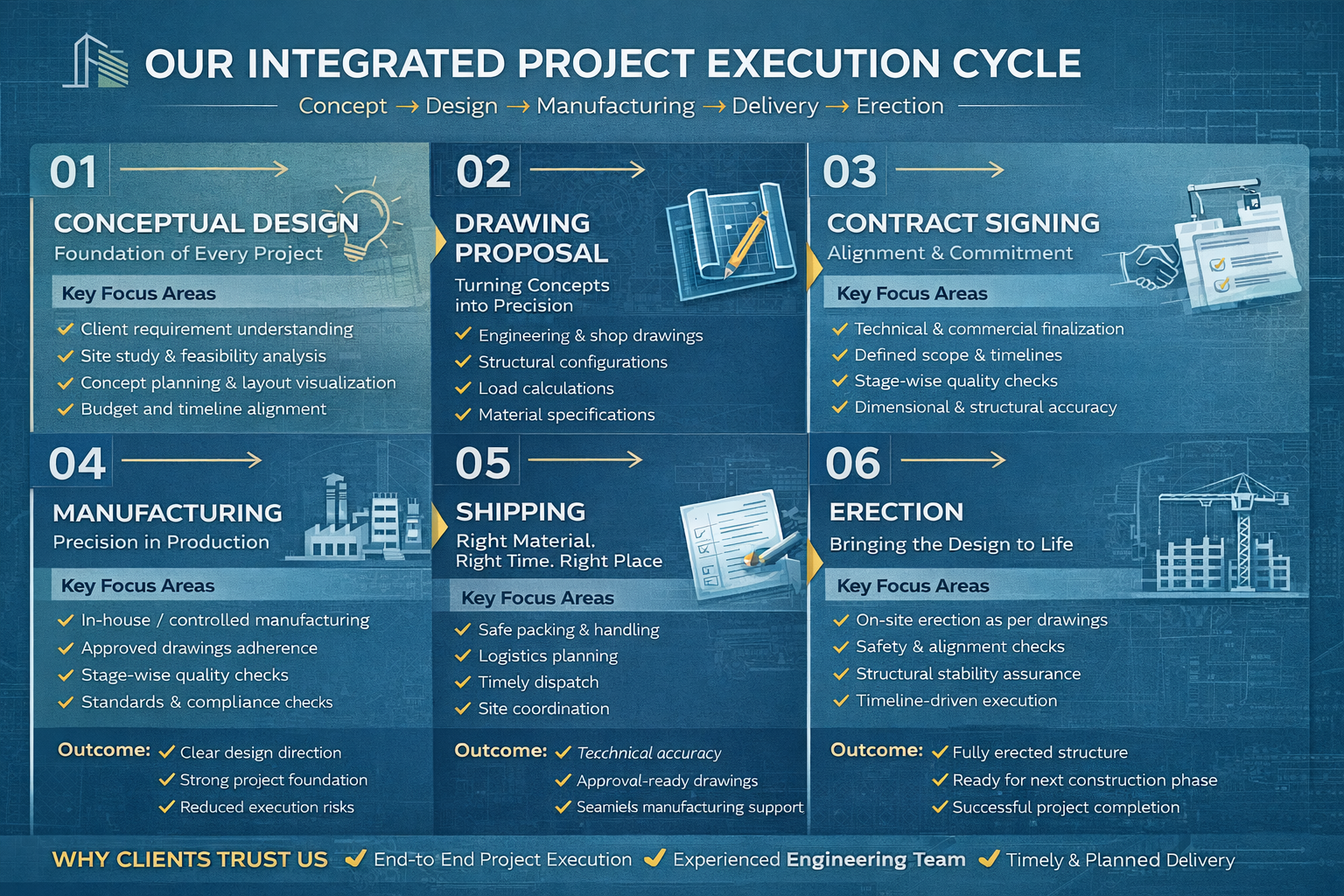 At Vastech, every project follows a structured and transparent execution cycle that ensures clarity, quality, and timely delivery. Our integrated approach allows seamless coordination between design, manufacturing, and on-site execution, minimizing risks and maximizing efficiency at every stage.